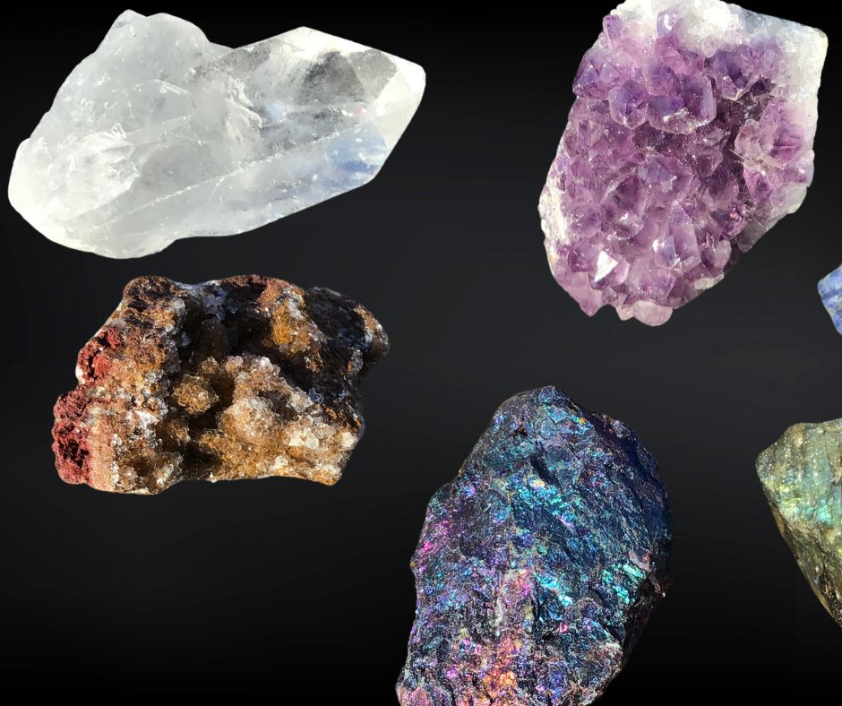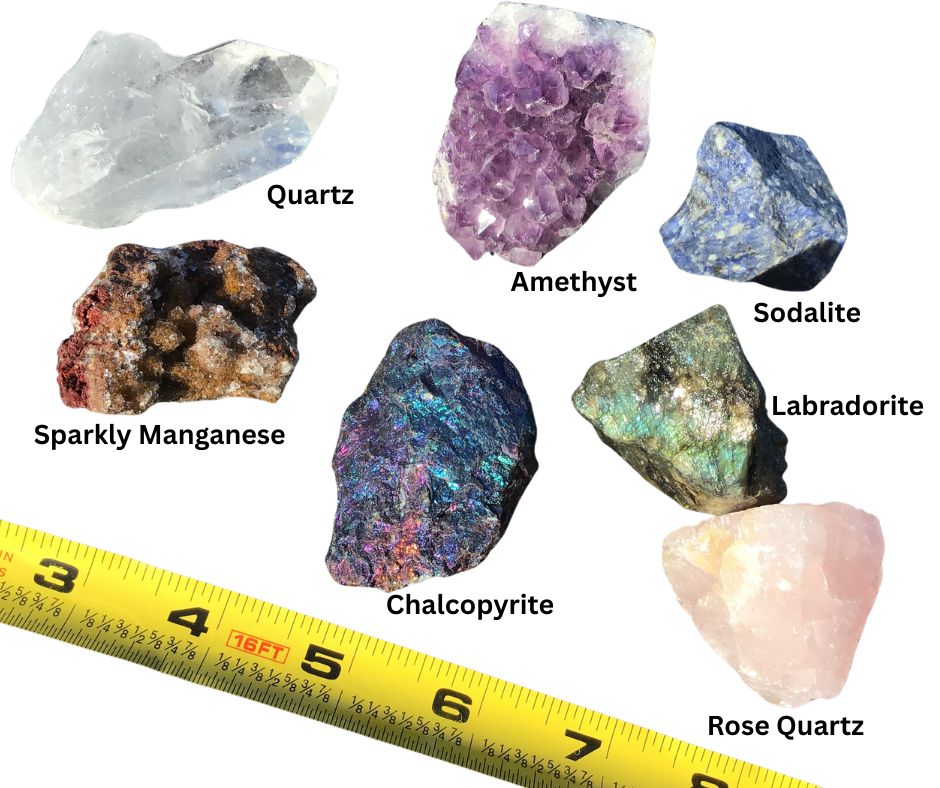 HAND-SELECTED, NOT MASS-PROCESSED: Each specimen is carefully chosen for quality and uniqueness — including a Quartz Crystal Point, Amethyst Druze, Labradorite, Manganese Ore, Sodalite, Chalcopyrite, and Rose Quartz.
